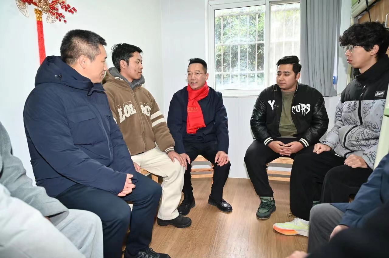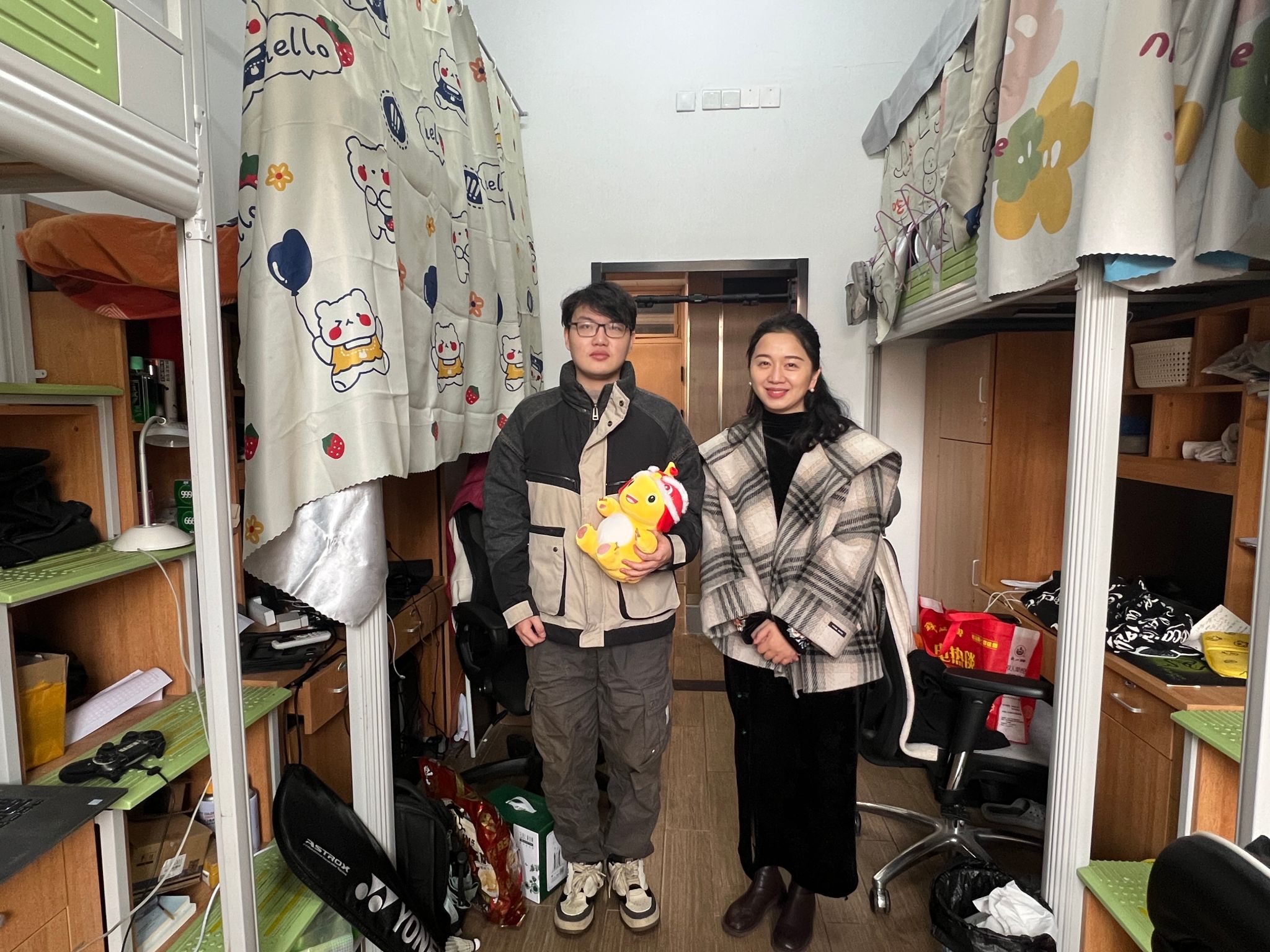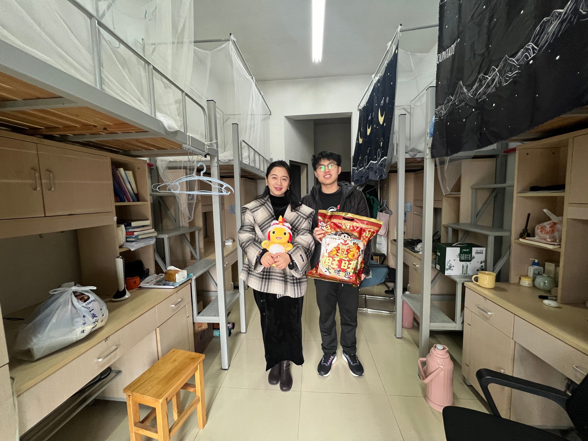 学生寝室门口挂着春节装饰,充满浓厚的节日氛围。校领导一行来到留宿的学生寝室,与学生亲切交流并送上节日问候和祝福。朱达书记在交流中强调了,学习是学生的首要任务,同学们要认真学习、查漏补缺,不断提高自己的综合素质。同时,也要注重锻炼身体,增强身体素质,为未来的学习和工作打下坚实的基础。 随后,校领导们为同学们送上了精心准备的新年礼包,让留校的同学们感受到了家的温暖。