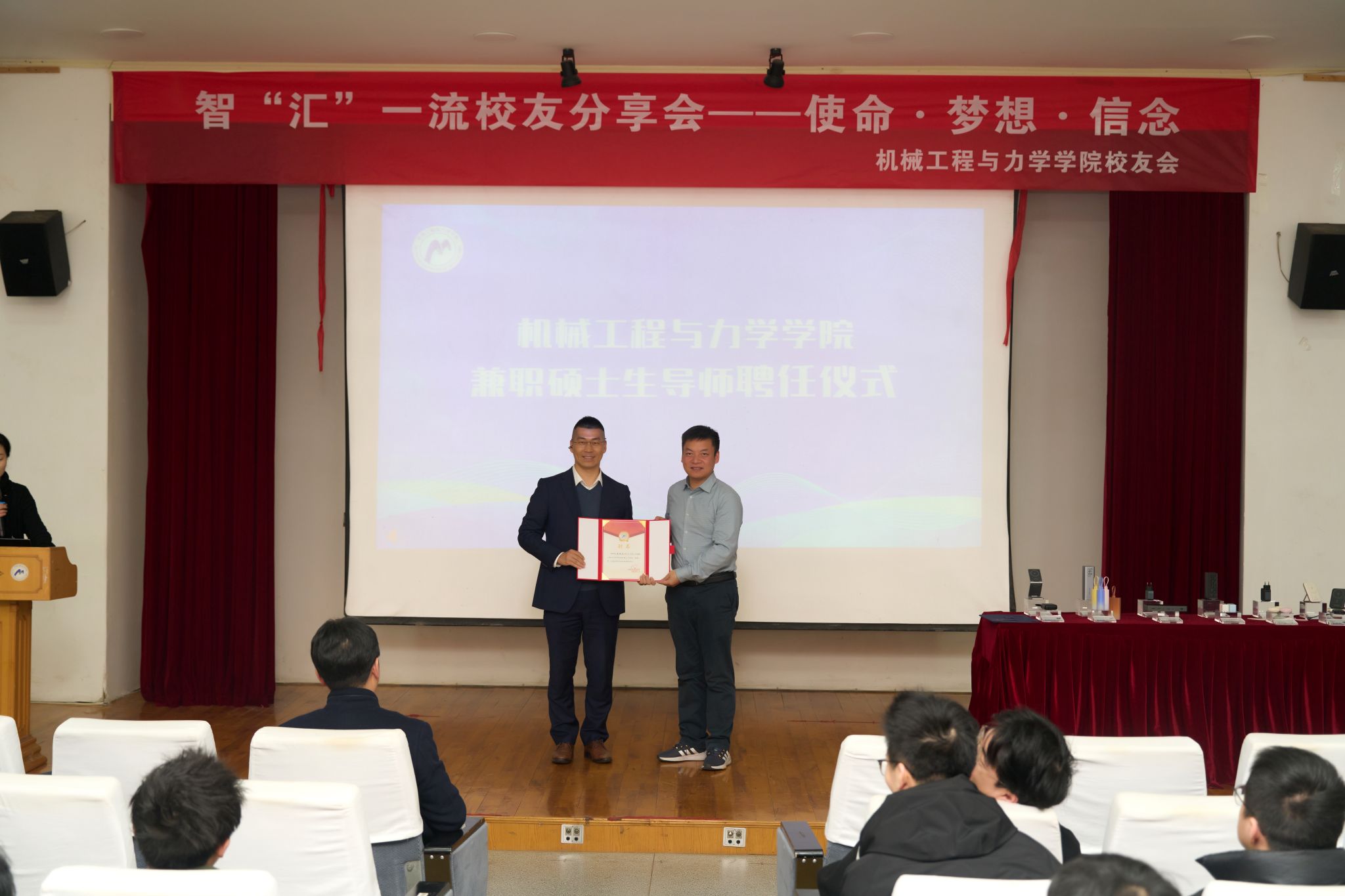 ”兼职导师。王书记指出,这份聘书要寻找的,正是像黄师兄一样“既懂实验室图纸,又懂市场蓝图”的导师,用创业智慧教学生如何将知识转化为价值。随后,彭文飞副院长授予了黄师兄“兼职硕士生导师”聘书,他表示,聘请像黄师兄这样的优秀企业家,能够用实战经验为硕士生的成长提供“脚手架”,让学术研究与企业需求同频共振。两份沉甸甸的聘书,为校企协同育人注入了新的力量。
