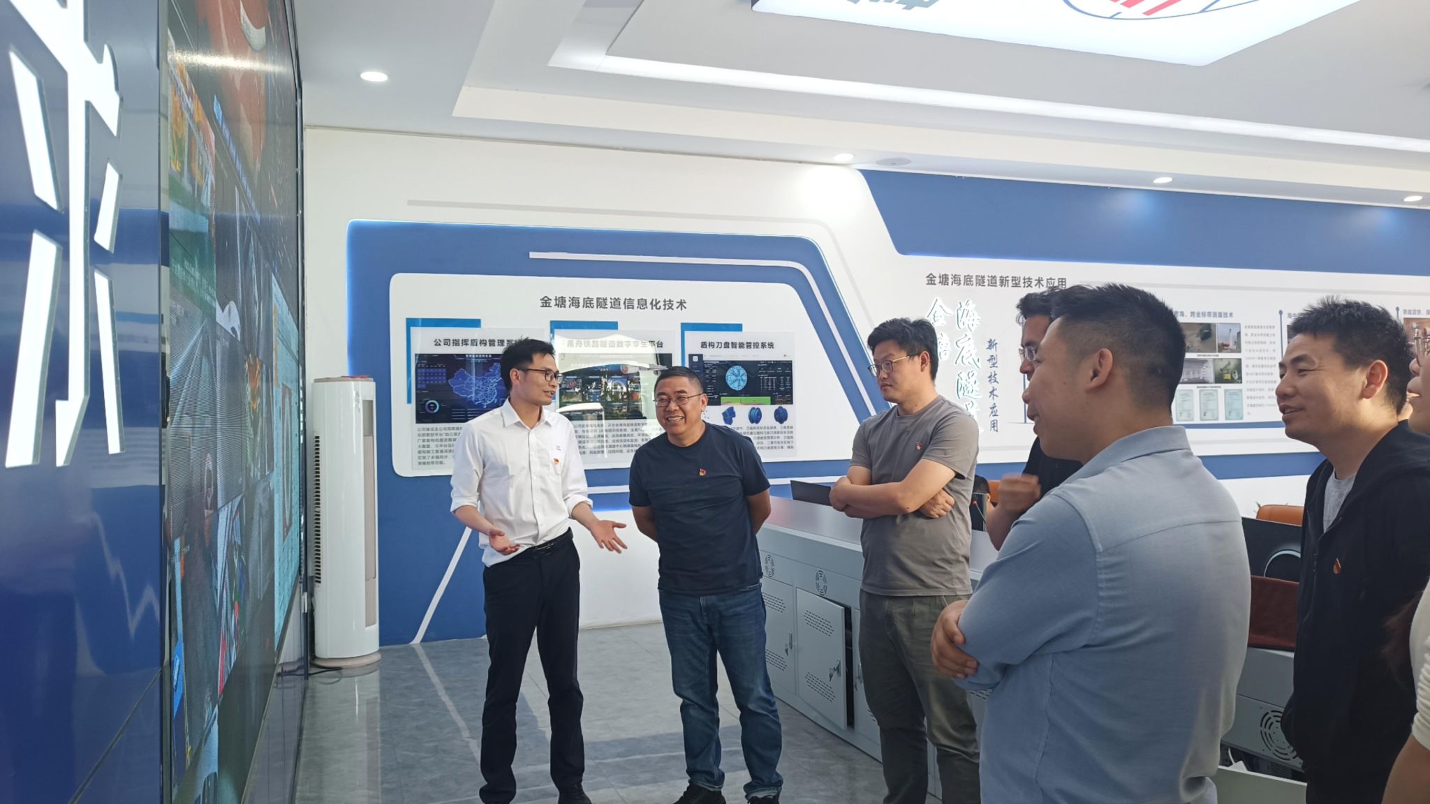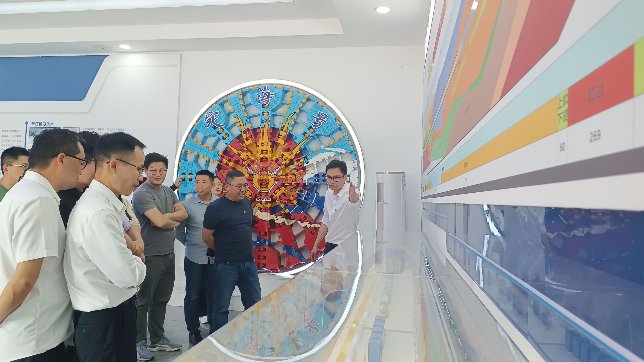 座谈会后,在项目部技术人员的带领下,全体人员现场参观甬舟铁路金塘海底隧道工程信息化演示大厅、“定海号”盾构机模型以及甬舟铁路海底隧道施工现场,深入了解海底隧道“定海号”超大直径盾构机施工工艺、安全控制及智能化监测技术,针对隧道掘进中的振动控制、围岩稳定性分析、高水压环境下的结构安全等问题展开热烈交流,为后续科研合作提供了重要参考。