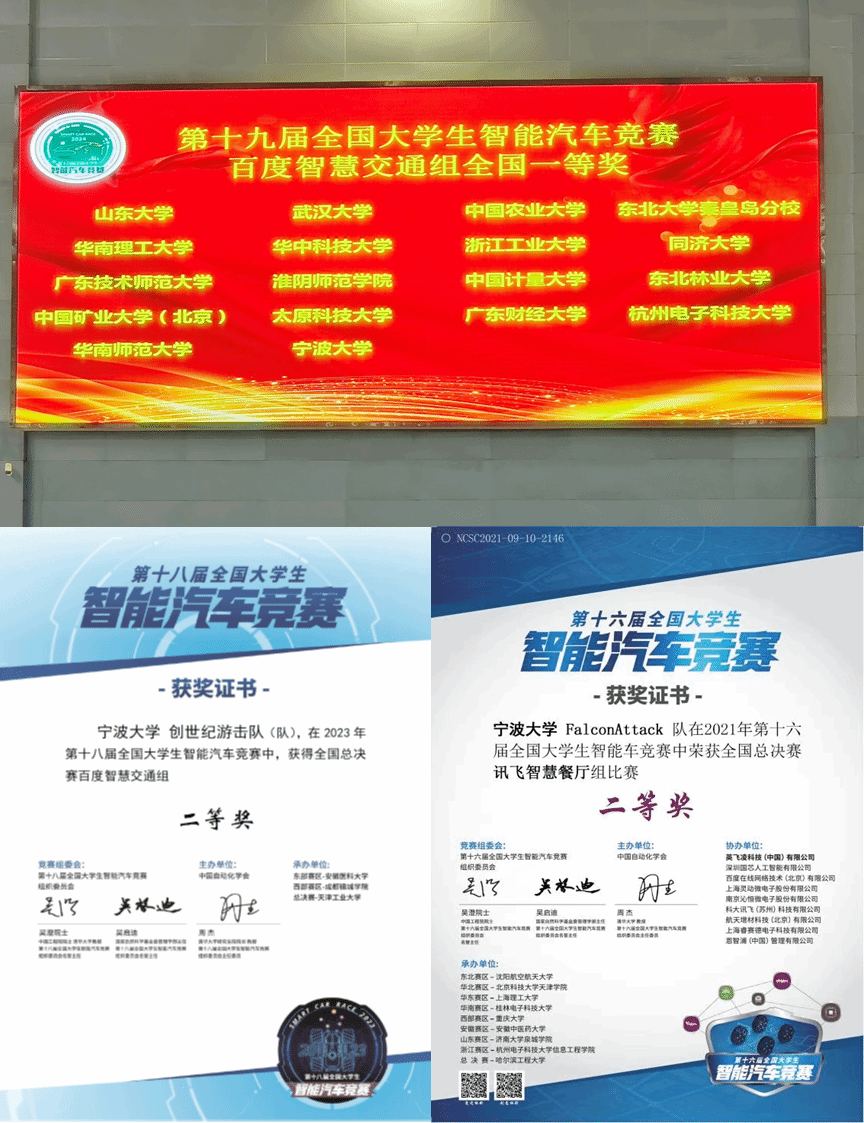 智能车队伍经过两轮比拼成功拿下百度智慧交通创意组赛道全国一等奖的好成绩。金枭洋、张跃家、钱文宇、毛国权、游心懿等五名同学此前在讯飞智慧医疗创意组比赛中也荣获了全国二等奖的好成绩。