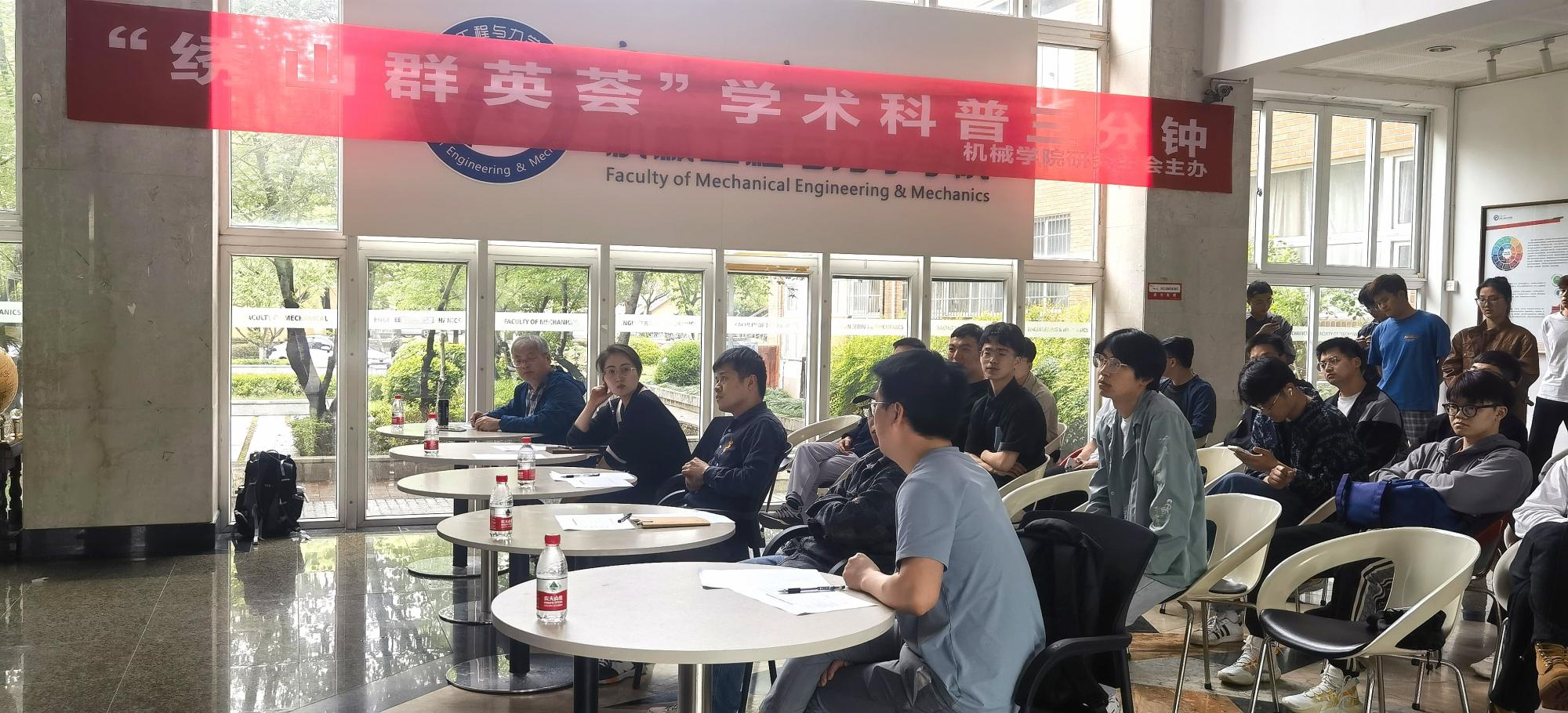 在绣山工程楼一楼大厅展开“绣山群英荟”学术科普三分钟活动,周风华、李科斌、任潞、林龙飞和潘晶婧五位老师担任评委。