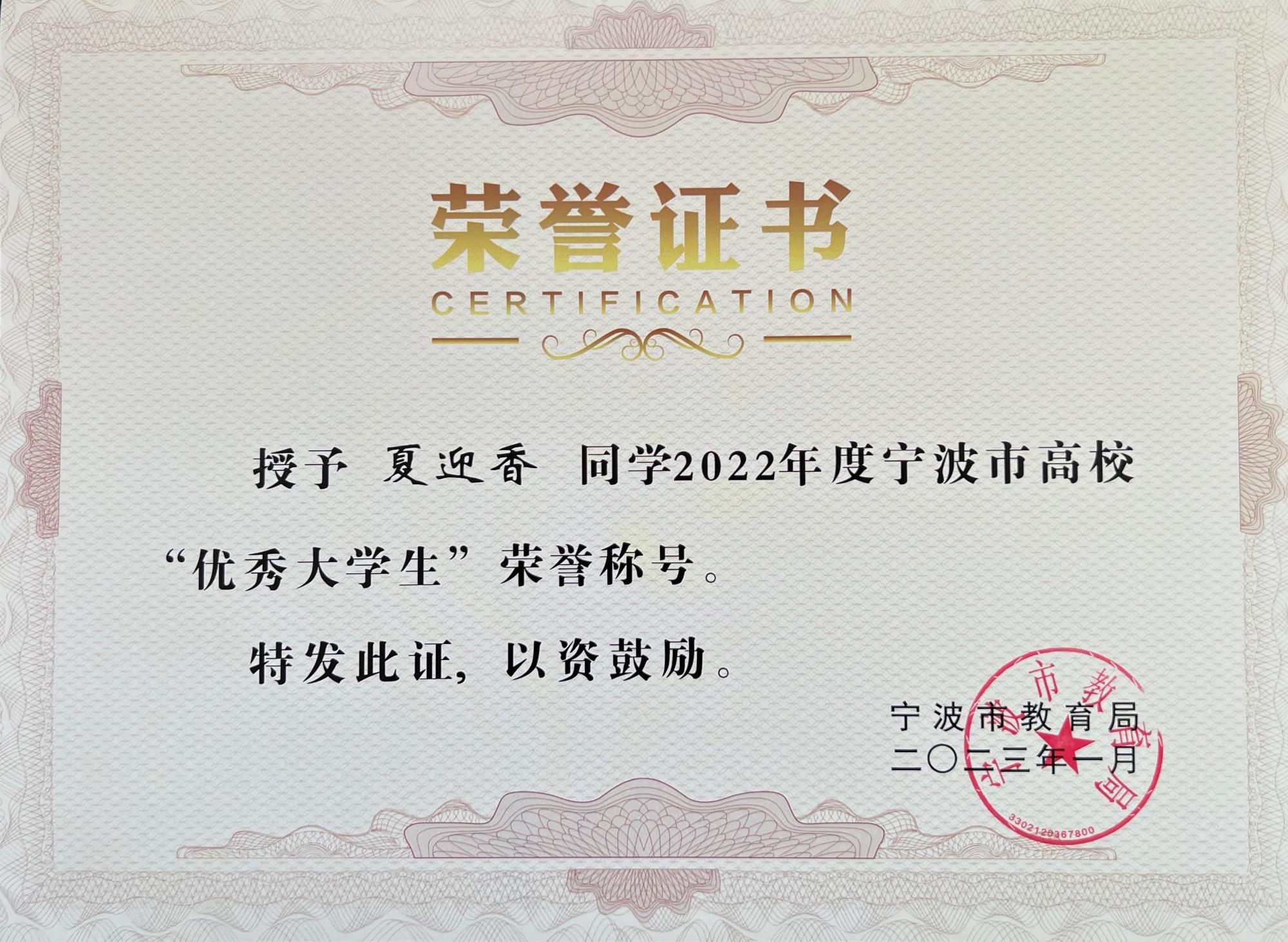 学子获2022年宁波市高校“优秀大学生”和“大学生励志标兵”荣誉称号