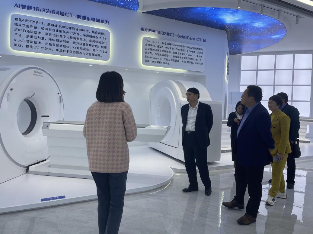 领导及校友代表一行表示热烈欢迎,并介绍了明峰医疗系统股份有限公司的发展现状。明峰医疗成立于2011年,是集CT、PET/CT、MR、PET/MR、DR、US、明峰云、人工智能AI的研发、生产、销售于一体的高科技企业,为全球客户提供尖端影像医疗设备一体化解决方案。公司拥有上百项世界领先的专利技术,被评为“浙江省引进培育领军型创新创业团队”、省级重点企业研究院——“浙江省明峰核医学影像系统研究院”、浙江省博士后工作站。先后承担科技部多个“十二五”国家支撑项目和“十三五”国家重点研发专项。