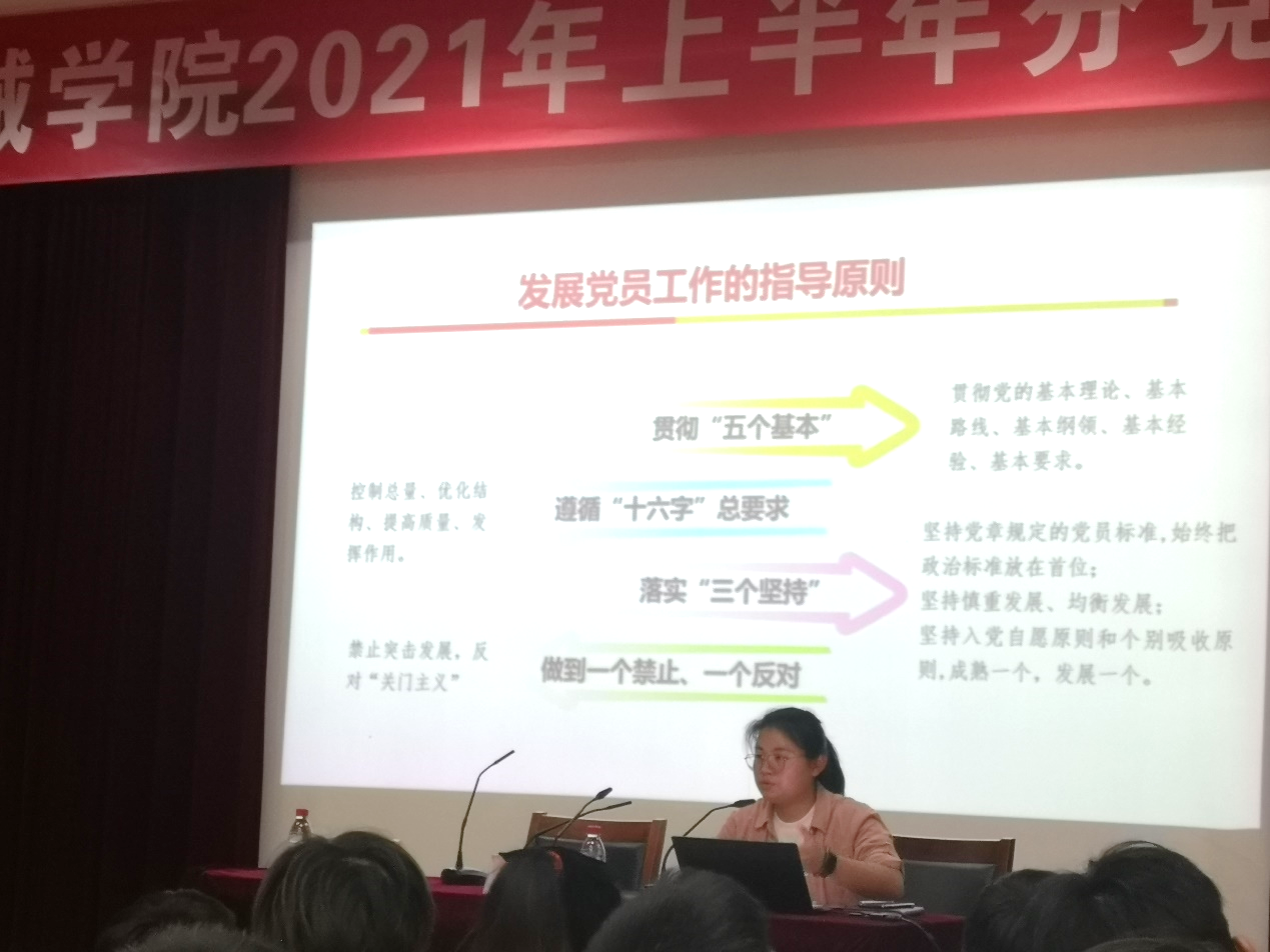 褚慧丽老师为同学们介绍了发展党员工作的依据、发展党员工作的指导原则、发展党员工作的五个环节等内容,使同学们更加清楚入党流程,她对“十六字”总要求进行了详细解读,要以控制总量为重点、以优化结构为关键、以提高质量为核心、以发挥作用为目的,重点强调了入党的五个阶段,即入党申请人、入党积极分子、发展对象、预备党员和正式党员。同时,褚慧丽老师强调要坚持“高质量发展”,要坚持向党组织推荐优秀的共青团员;无论作为入党积极分子、发展对象还是预备党员,在任何场合都要发挥党员的先锋引领作用,要时刻将入党誓词铭记于心,并付诸实际行动。最后,褚慧丽老师与大家分享了自己学习、工作的经历,借此鼓励同学们努力学习,积极向党组织靠拢,争取早日成为一名合格的共产党员。