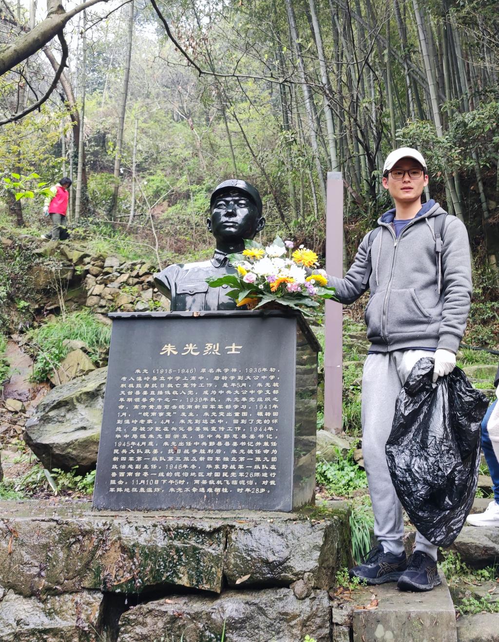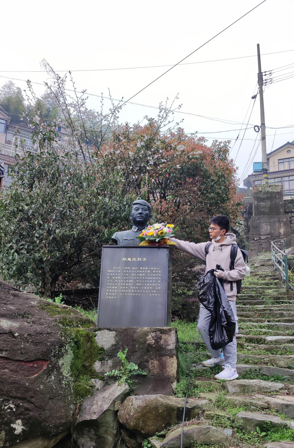经过路边的烈士像,大家凝重地献上手中的鲜花。惠民村作为四明山根据地的红色堡垒村,其名称就来源于郑惠民烈士。郑惠民烈士出身贫寒,但在党的培养下,积极参加抗日救亡运动,在一次执行任务的过程中不幸被捕,因严守秘密被敌杀害,年仅28岁。烈士对党忠诚,不屈的精神感染着同学们,此次环保之行也更加坚定。