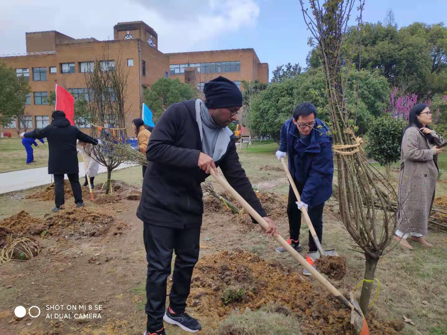 下午14:30,大家准时到达包玉刚图书馆左侧的大草坪,现场已经支起了一排小彩旗,提前挖好的树坑里斜放着梅花树苗,桌面上摆放着铁锹、水桶等相关植树工具。师生根据人数分为四组,纷纷戴上白手套,有人扶着树苗,有人一铲一铲往坑里填土。填到一半时,浇了些水,用铲子把土拍实。最后在园林师傅的示范下,大家用脚踩实了树干与泥土接触的部位,使树苗牢牢固定在土中。在共同合力下,不一会儿,树苗的种植就完成了。
