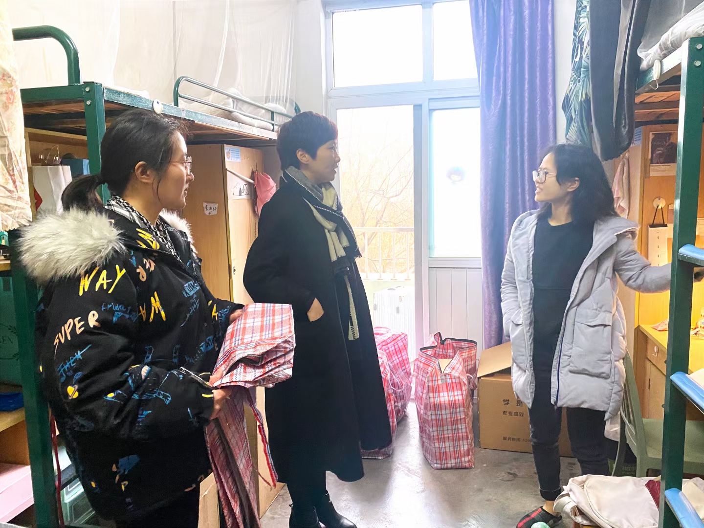党委副书记邵丽和学工老师们进行了南门寝室的走访慰问。在走访中,邵丽老师亲切地与学生交谈,提醒她们要趁这次搬迁机会断舍离,做好个人物品的整理和收纳。