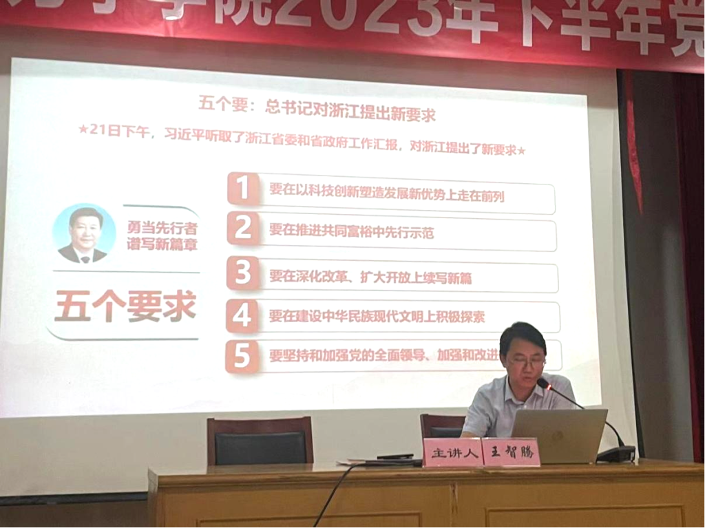 王智腾书记首先介绍了总书记第六次赴浙江的行程:在全面贯彻落实党的二十大精神开局之年,在“八八战略”实施20周年之际,习近平总书记再次亲临浙江考察指导,出席杭州亚运会开幕式,并先后到金华、绍兴等地,深入农村、商贸市场、文化园区考察调研,看望慰问基层觉员、干部和群众等一系列重要活动。