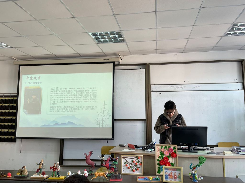 廉洁面塑青年做。镇海区面塑非遗传承人黄铁军现场介绍了面塑艺术的相关知识。在体验环节中,中外学生在老师的指导下在手中几经捏、搓、揉、掀,再用竹刀点、切、刻、划,合作进行面塑制作。国际学生代表在本科生党支部同学的帮助下,在面塑作品中用汉字书写本次主题——“清风常伴,清廉校园”。