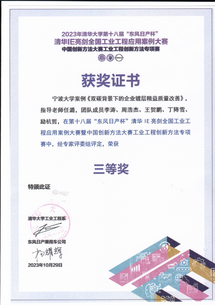 工业工程系在此次大赛中共有五组报名项目参赛,由林文文,任潞,王瑞,余军合作为指导老师,李涛,王飞,朱铭铭,冯高松,谢珊珊等学生作为带队学生共同参加。获得了两项三等奖,分别是“数据驱动的新能源公交车动力电池SOC估计”和“双碳背景下的企业镀层精益质量改善”。