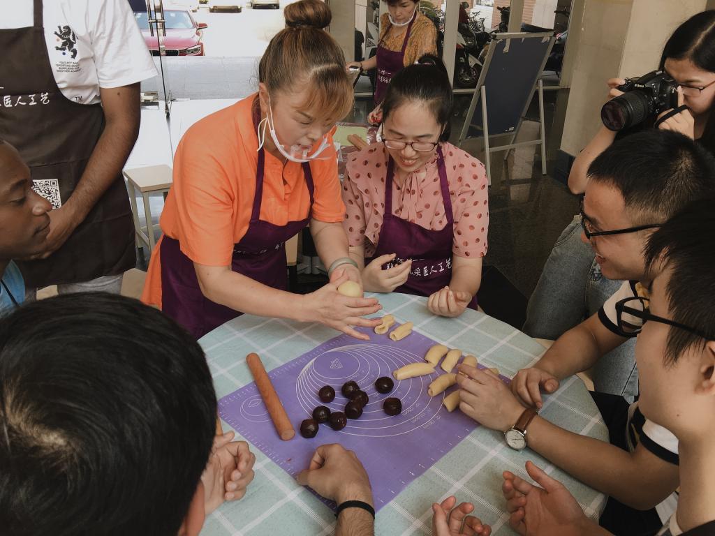 活动伊始,同学们以中英文对照解读苏轼的经典名篇《水调歌头·明月几时有》,以诗词赏析的形式让在场师生更好地了解中秋佳节的缘来与意义。在鄞州区潘火桥社区老阿姨们的指导帮助下,大家随后纷纷手工制作苏式月饼和广式月饼,并学习剪纸。来自乌兹别克斯坦的2019级留学生OLIMOV SULTON学的特别认真,“这是我第一次做月饼,也是第一次吃月饼,很开心认识很多新朋友,一起学了剪纸,真是丰富多彩的一天!让我对未来在中国的学习生活充满了期待。”