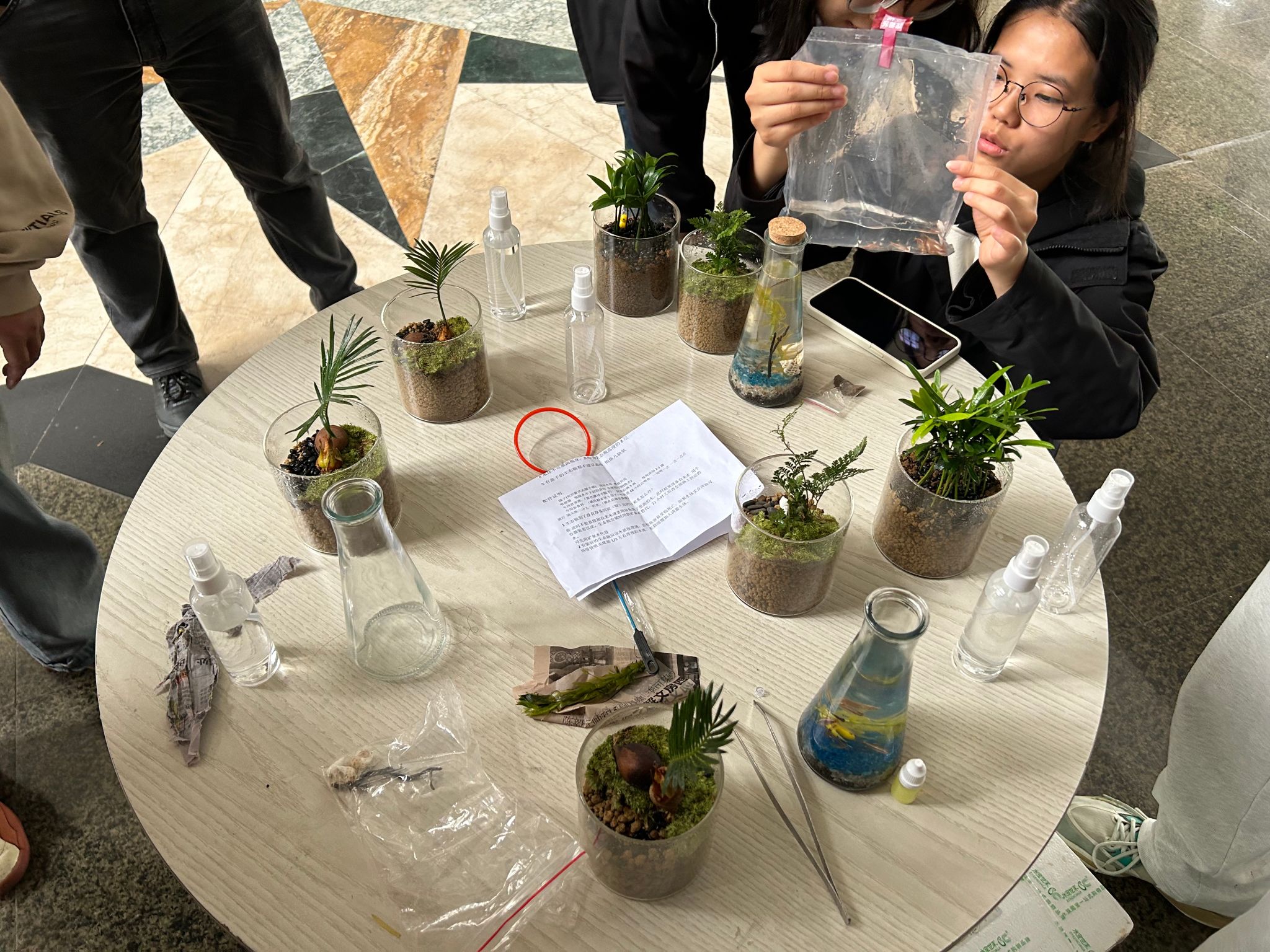 活动现场,大家变身成巧手花匠,从喜好风格出发,力求打造出一个个充满生命力和美感的微观世界。精心布局,动手创作,铺设土壤、种植苔藓、摆放装饰,不一会儿,一盆盆独具匠心、充满生机的微景观生态瓶便呈现在大家眼前。学生们一步步亲手制作生态瓶,了解到生态系统的组成及结构,通过观察其中生物的生活进一步体会它们之间相互依存、相互制约的关系。通过这些作品,学生们不仅展示了自己的才华和创意,也传递了对生命和自然的敬畏与关爱。