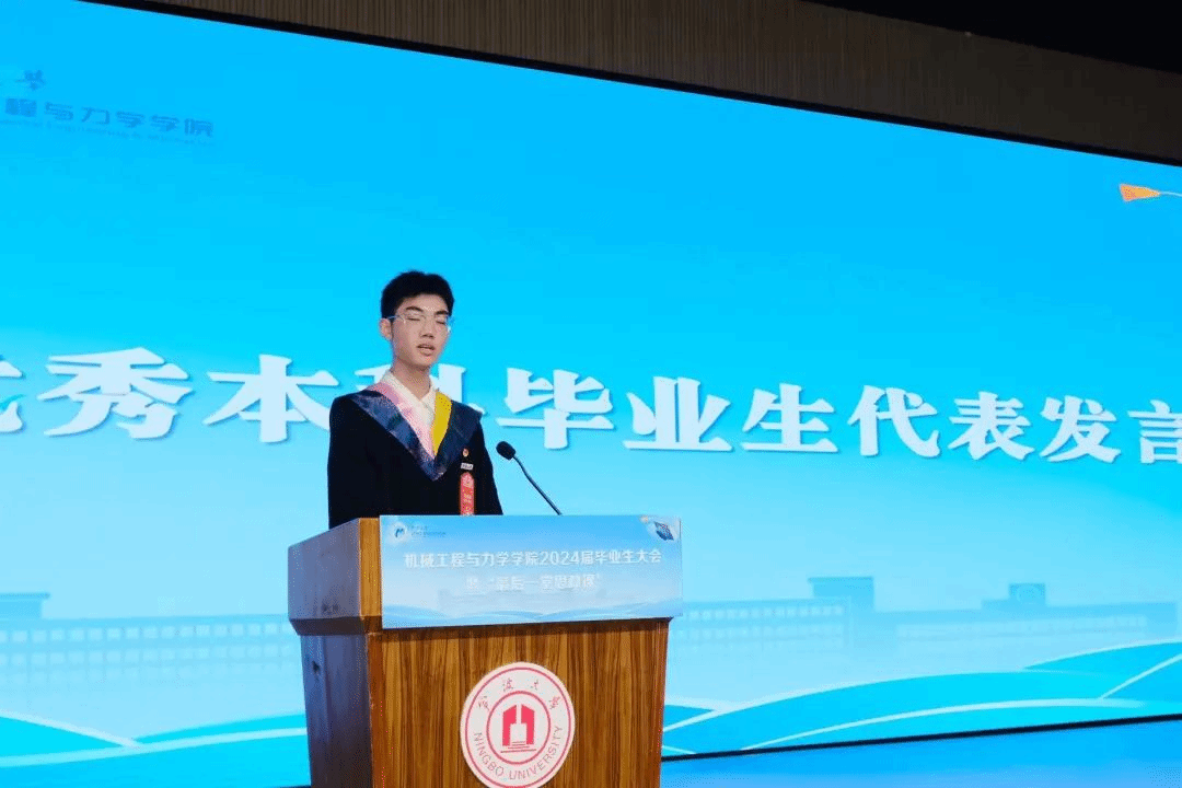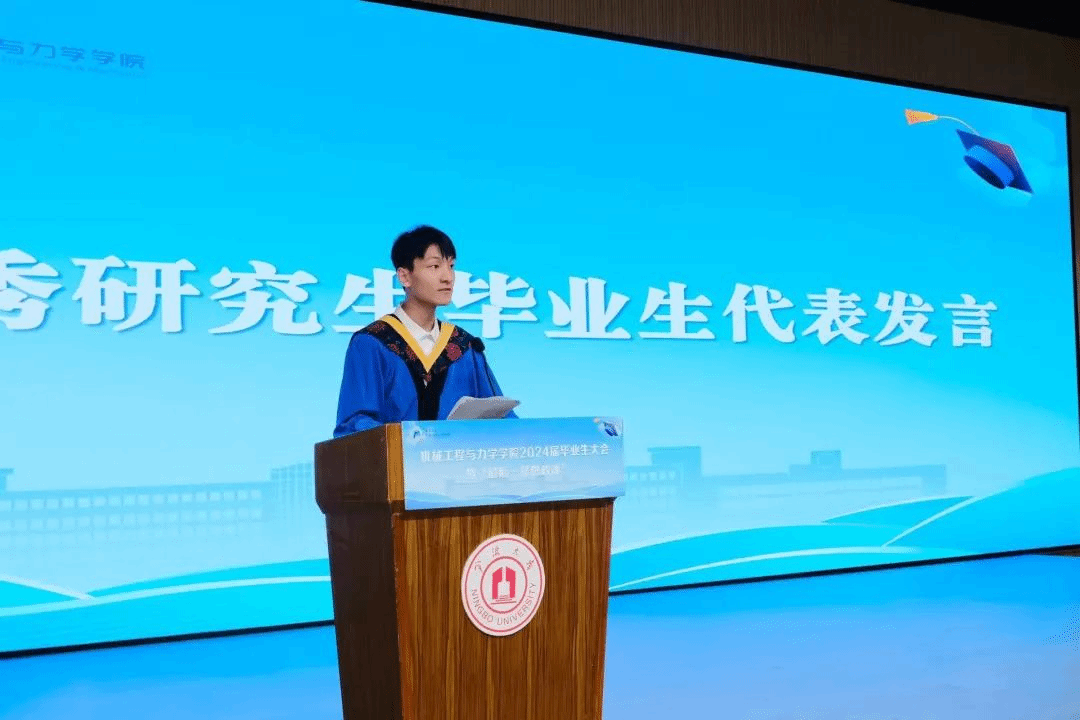 优秀毕业生代表2021级力学硕士研究生蒋昊成、2020级机械国贸专业本科生颜路晨上台发言,他们以真挚的情感和坚定的声音分享了自己在U体育网