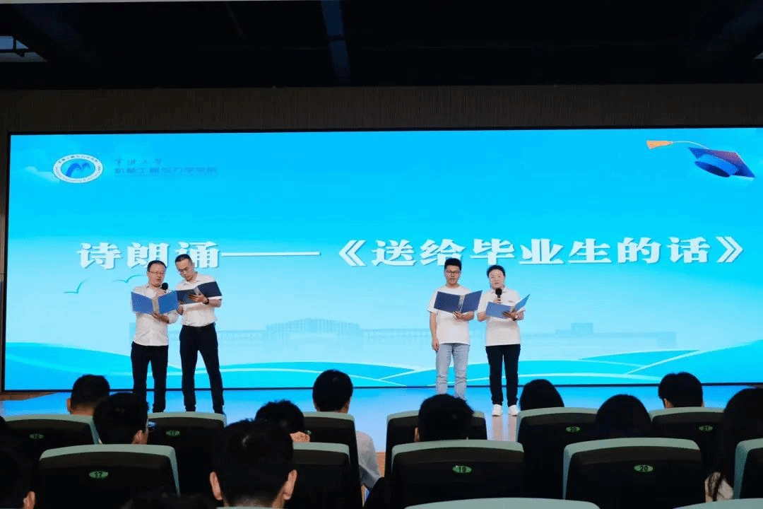 本科生班主任和研究生导师代表共同创作并朗诵,老师们用诗意的语言向毕业生们传达了最美好的祝愿和期许,赢得了现场阵阵掌声。