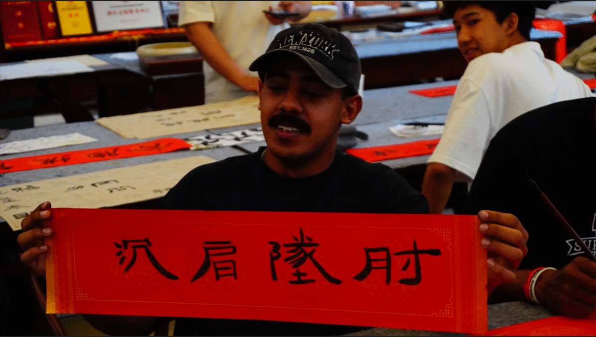 院长姜红升作为主讲人。用英语授课,手把手演示......在书写示范过程中,姜老师声情并茂,将太极动作融入书法中,一笔一划好似在演练太极,引得大家纷纷叫好,“Nice!”不绝于耳。在之后的书法体验中,每一位学生都沉浸其中,使出“浑身解数”,笔走龙蛇,体会汉字的结构之美。“中国太极”“含胸拔背”“气沉丹田”几个字叫姜老师也不禁拍手称赞。令大家惊喜的,还有“Chinese Kung Fu”。同学们纷纷站定,跟着姜老师的引导开始演练太极,舒展身心,完全放松下来,在一招一式中感受中国武术的独特魅力。