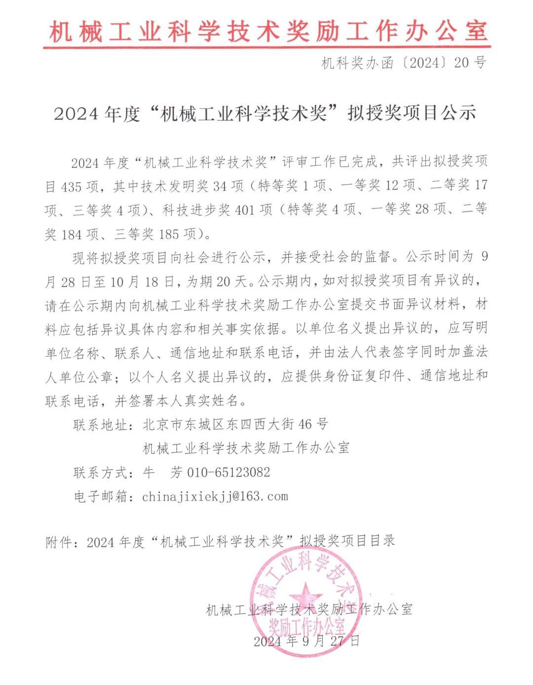 2024年度“机械工业科学技术奖”拟授奖项目公示,U体育网