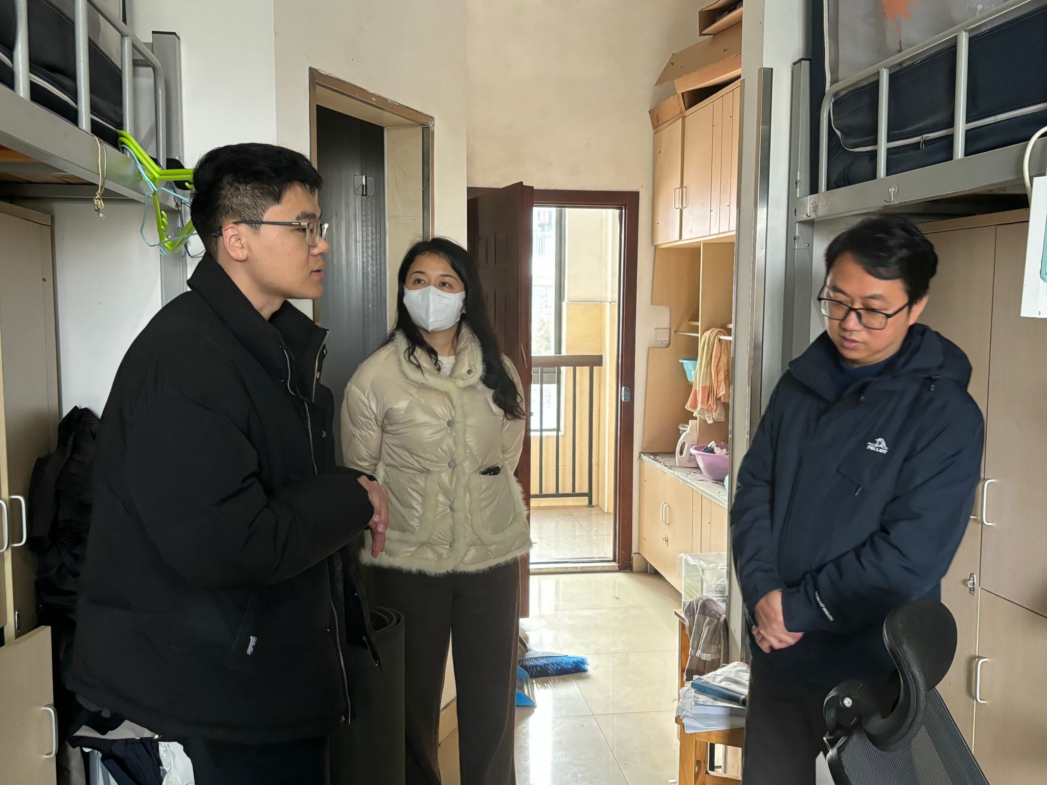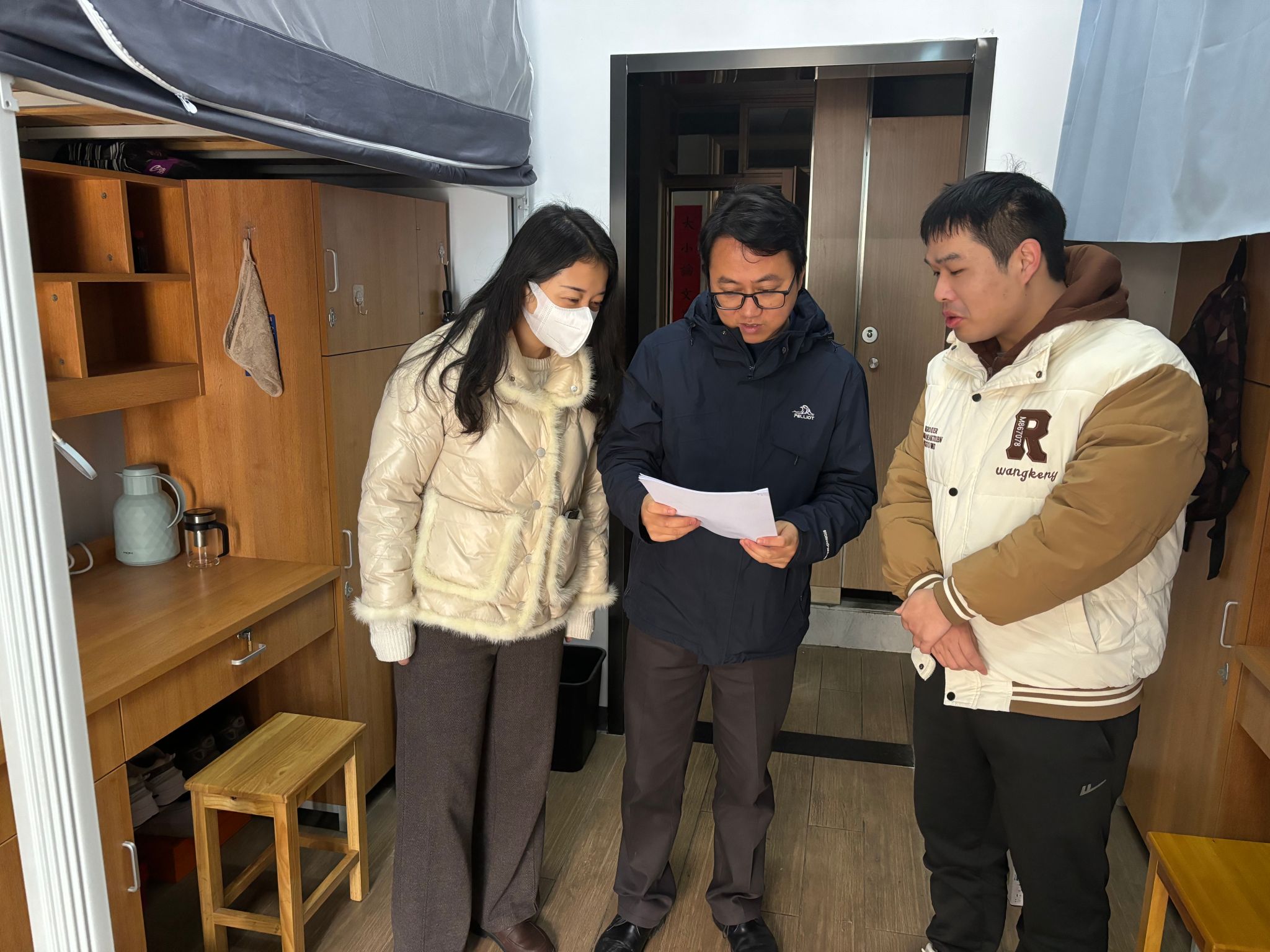 党委书记王智腾、党委副书记沈妍伶,在辅导员的陪同下,一同慰问了春节留校学生,并为他们送去了新春慰问品。