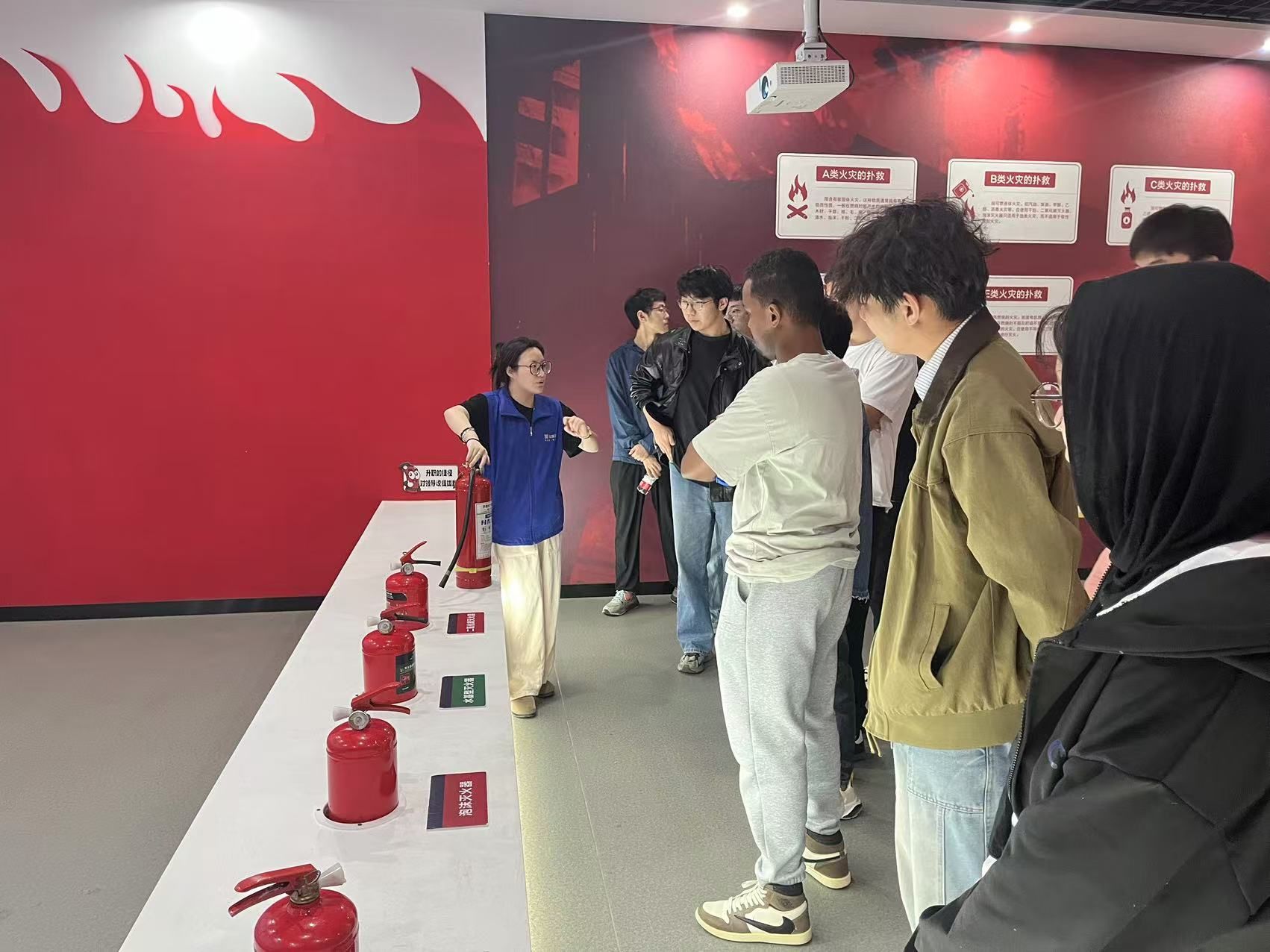 活动开始,古林镇全域平安体验中心的吕老师带领支部成员到达消防知识展馆,观摩消防员作战装备、辨识安全标识体系、实操干粉灭火装置等环节,让同学们全面掌握初期火情的处置规范,并通过情景模拟的方式讲解不同标识的使用场景。之后大家在VR消防展馆亲身体验灭火场景,通过这种身历其境的VR模拟,更清楚的知道如何正确使用灭火器。