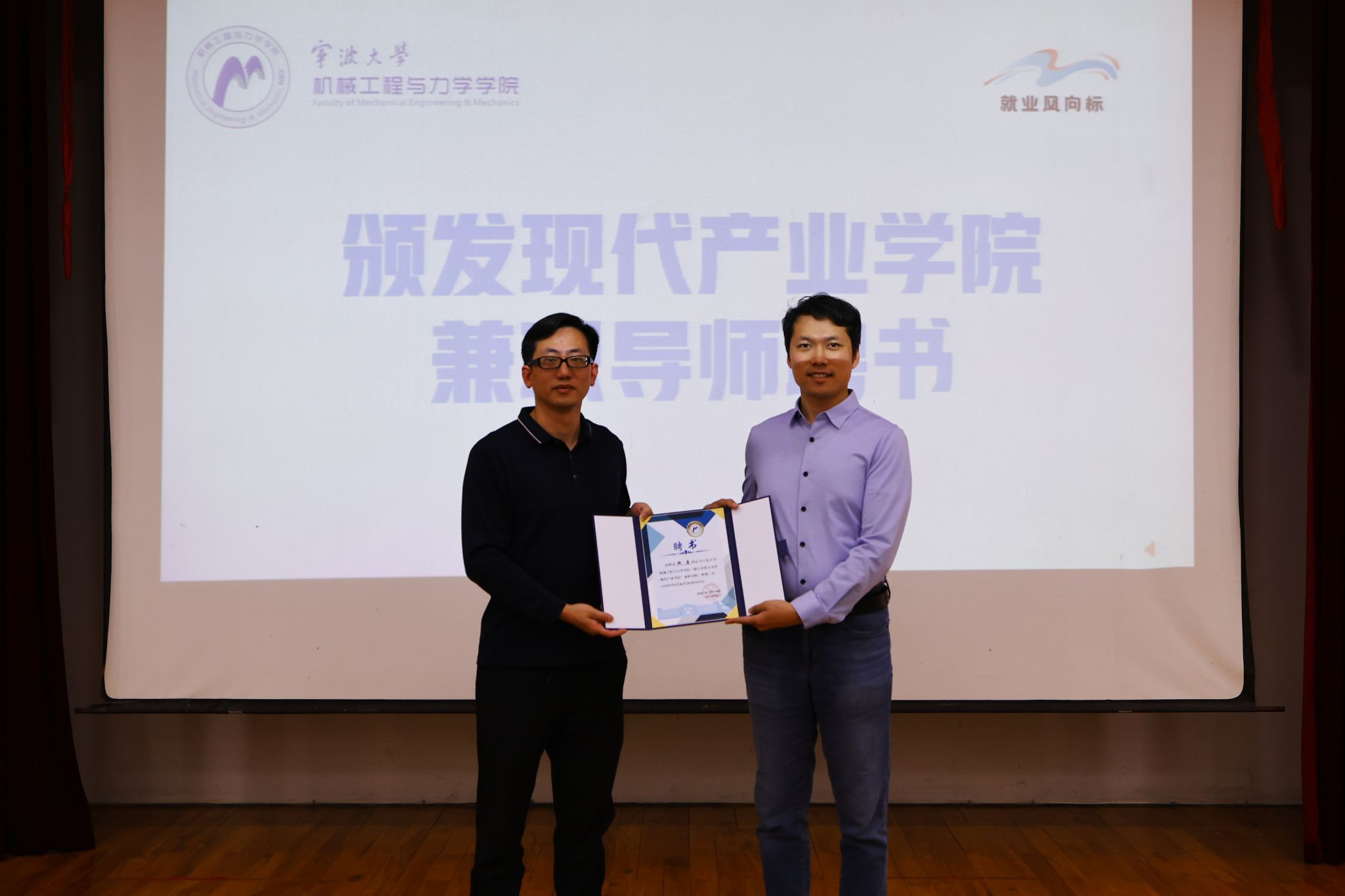 兼职导师聘任仪式。郑宇轩副院长为郑康院长颁发导师聘书。