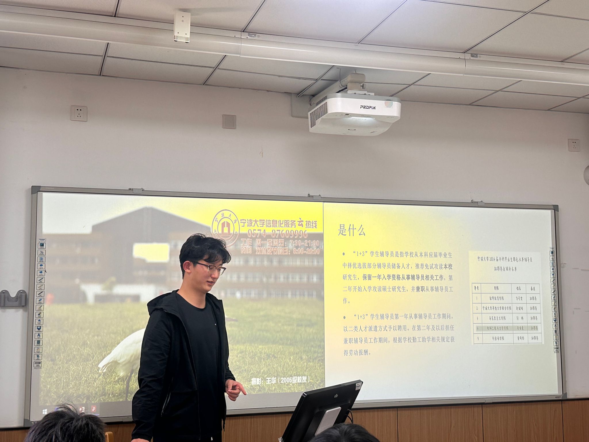 通过“1+3”学生辅导员推荐上岸本校的李俊豪学长结合自身经历讲解了“1+3”政策、报考流程、思考与展望等,为学弟学妹们带来了全面而实用的经验分享。他指出这一政策不仅为优秀学生提供了免试攻读本校研究生的宝贵机会,还能让学生提前融入科研团队,获得导师一对一指导。随后,李学长详细梳理了报考流程,从材料准备、U体育网