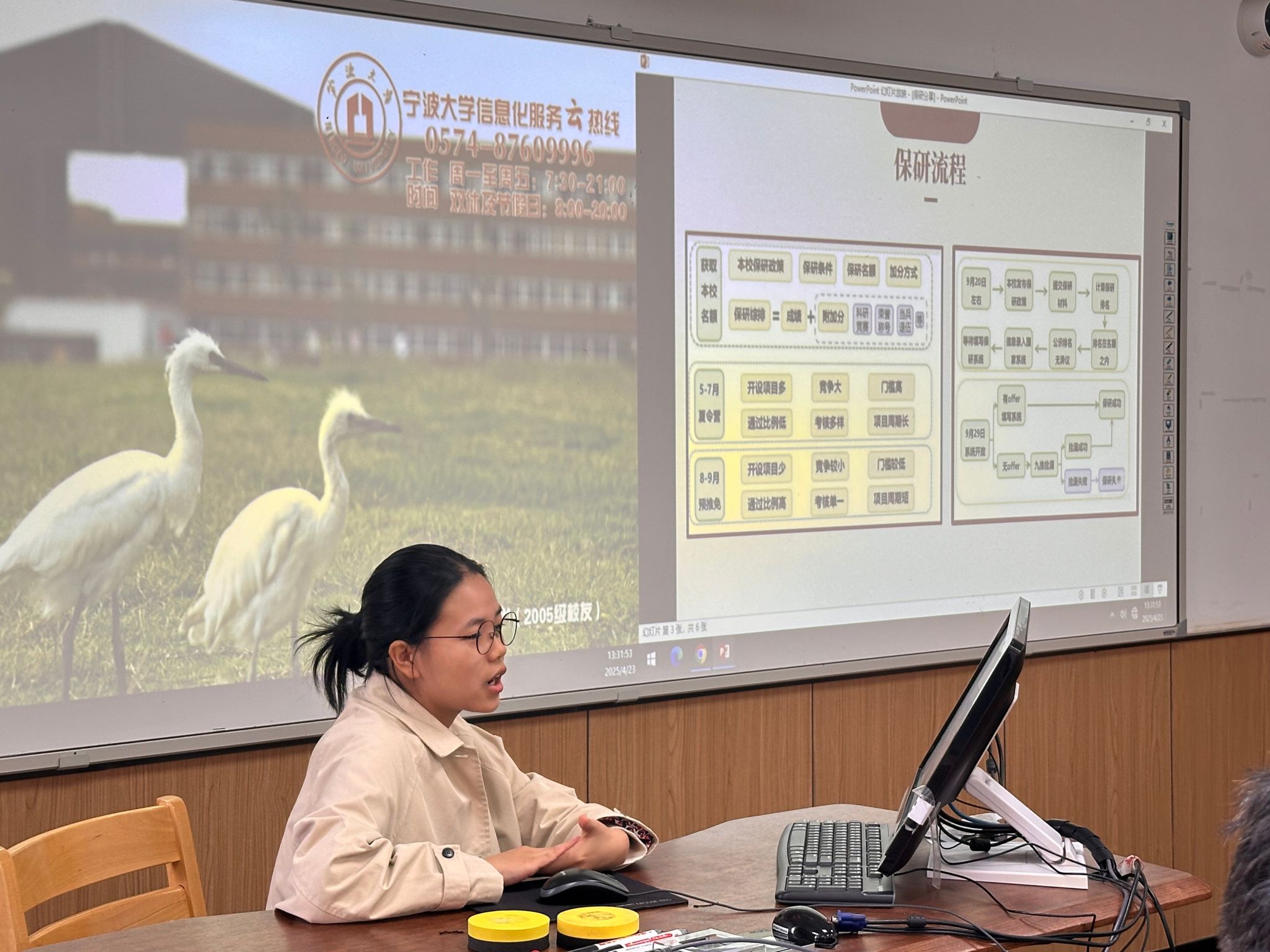 在分享会上,机械国贸专业游心懿学姐结合自身保研至湖南大学的经历,从推免流程、推免准备、推免技巧、论文竞赛等展开经验分享,强调结合学科排名择校、结合自身兴趣和导师研究方向积极参加竞赛活动和科研项目。在推免流程方面,分析重要的时间节点,鼓励同学们广泛收集信息,积极寻求老师和优秀学长学姐的帮助指导。