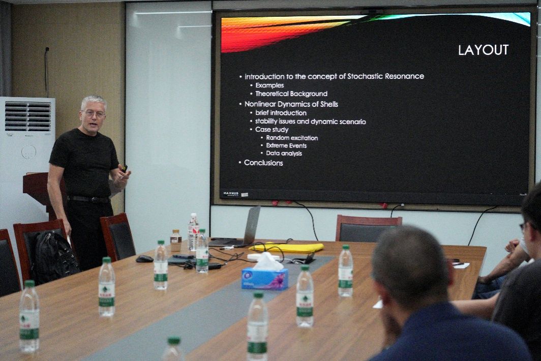 6月11日下午,意大利摩德纳—雷焦·艾米里亚大学Francesco Pellicano教授受邀来访U体育网 极端环境交叉力学研究所,在龙赛理科楼南楼519会议室,为U体育网 师生带来一场题为“Stochastic Resonances”的学术报告。报告由林骥研究员主持,U体育网 相关专业师生积极参与交流学习。 Francesco Pellicano教授从实证与理论双重视角深入浅出地阐述了随机共振的概念。他围绕“简介概述”“稳定性问题和动态场景”及“案例分析”三个部分,重点探讨了壳体的非线性动力学特性。通过实验演示,教授生动展示了壳体结构在不同环境条件下出现的复杂动态现象,并揭示了尖峰振荡的内在规律——其频谱内容与结构自然频率高度匹配,衰减模式亦类似自由结构振荡的瞬态响应。与会师生反响热烈,认为报告内容详实、启发性强。此次报告不仅拓宽了大家的学术视野,也为师生间的交流互动搭建了宝贵平台。(图文:李琼 极端环境交叉力学研究所)