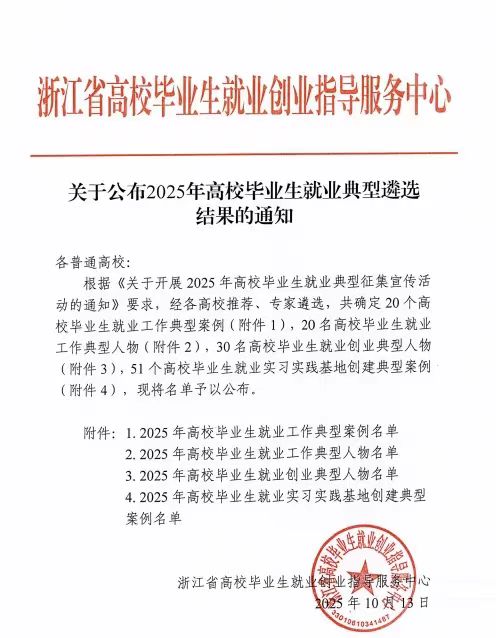 近日,浙江省高校毕业生就业创业指导服务中心公布《2025年高校毕业生就业典型遴选结果》,共设四类典型:高校毕业生就业工作典型案例、就业工作典型人物、就业创业典型人物、就业实习实践基地创建典型案例。U体育网