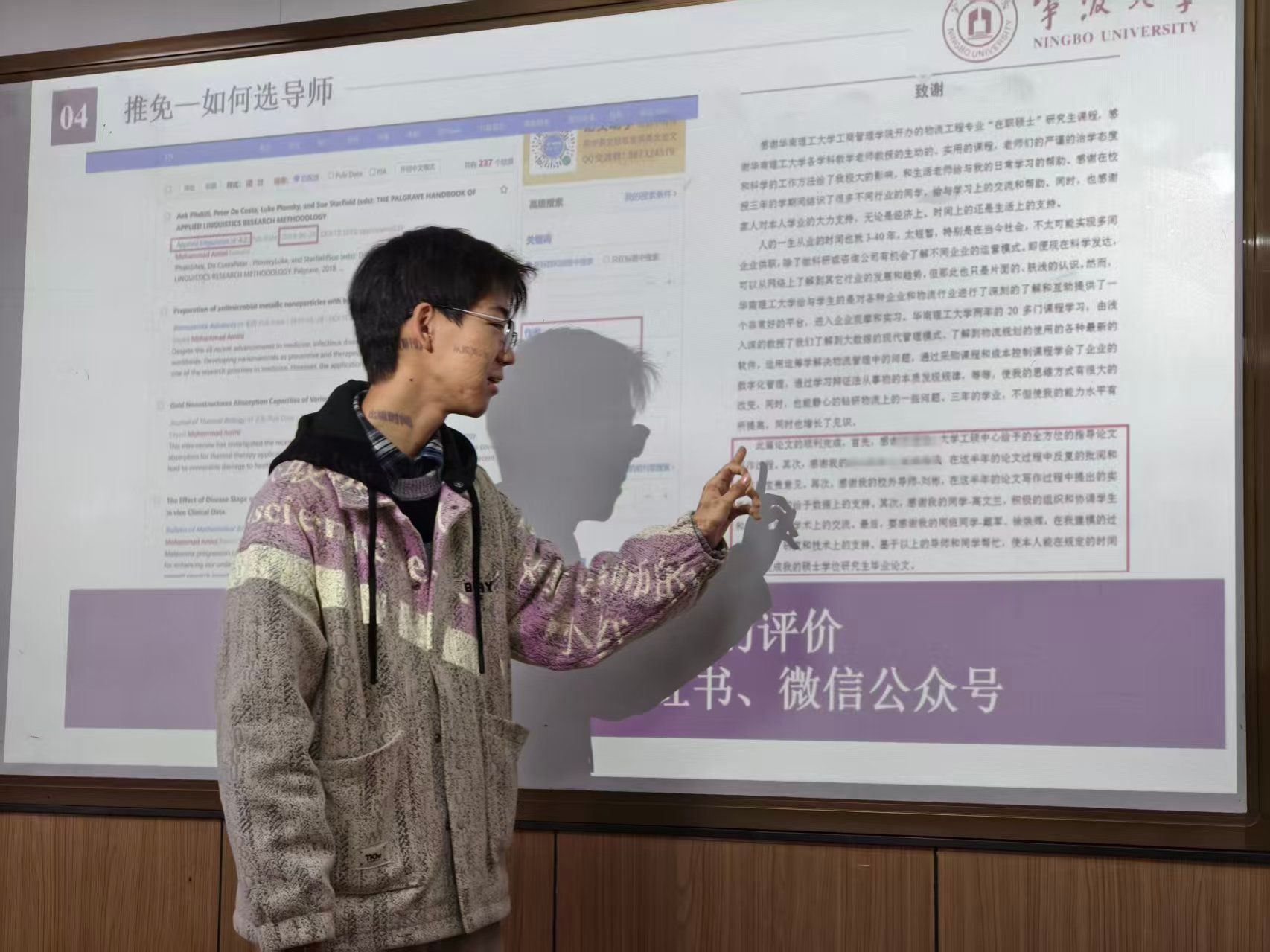 最后登场的是手握南洋理工大学、皇家墨尔本理工大学等多个名校offer的黄耀鑫同学,他为有志于出国留学的同学打开了一扇清晰的窗口。黄同学的分享条理清晰,覆盖了海外申请的全程规划。他重点讲解了如何根据个人研究兴趣、学术风格和职业规划,通过多种渠道筛选并选择一位“最适合”自己的海外导师,强调了早期学术联系(套磁)的策略与重要性。随后,他逐步解析了从语言考试准备、文书(个人陈述、简历)撰写与打磨、选校定位,到最终提交申请及应对面试的各个环节,并提醒同学们注意不同国家、不同院校的项目特点与申请截止日期,做好时间管理。