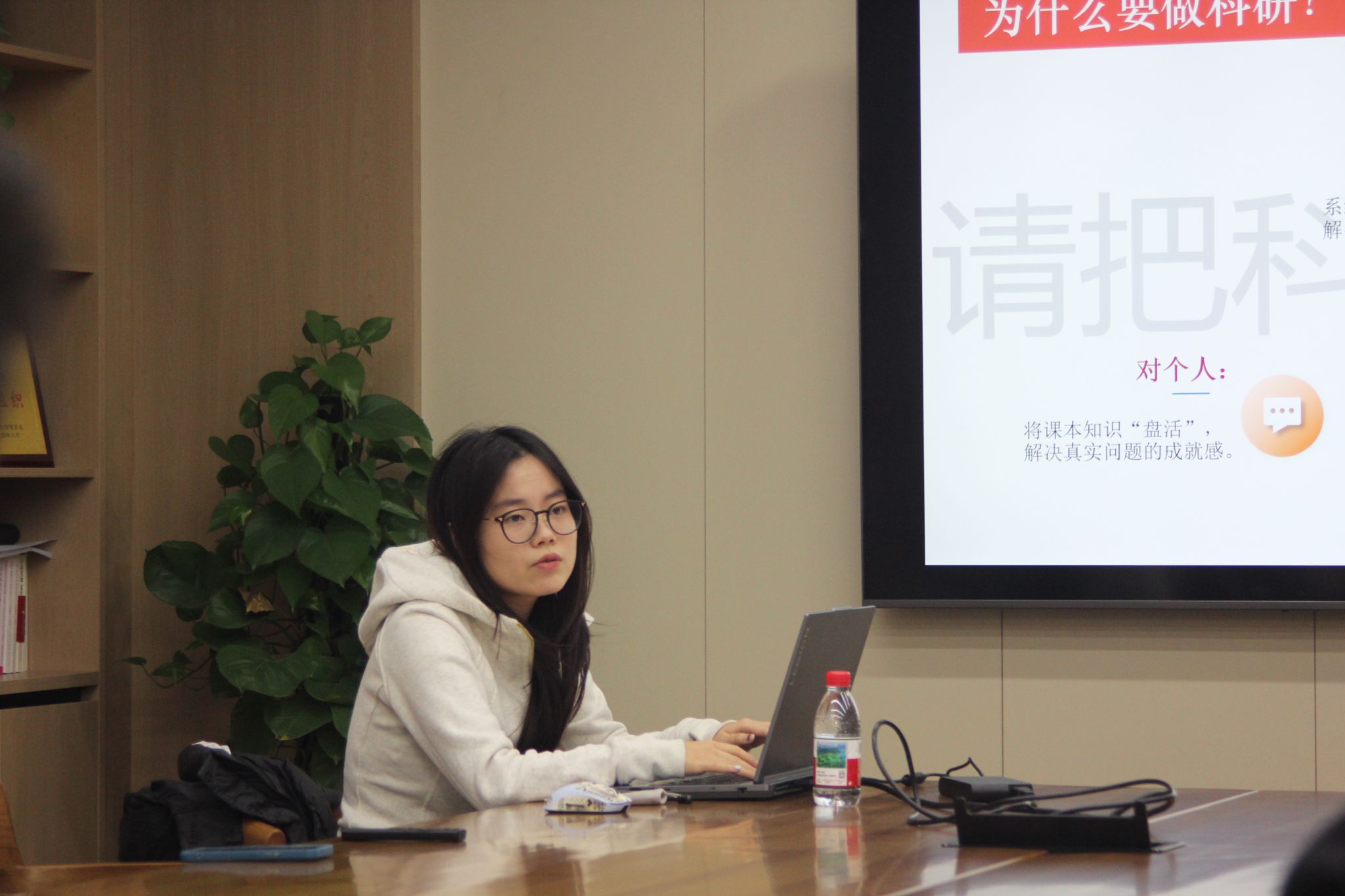 任晓雯同学以“从 0 到 1:解锁你的第一个科研项目”为主题,先辨析 “只有学霸能做科研”“需惊天想法”“低年级太早” 三大迷思,强调科研核心是主动与热情,低年级试错成本低,还阐述了科研对个人成长、能力提升及升学的价值。再分享科研灵感四大来源:课堂延伸、文献挖掘、生活观察、参与导师课题。并拆解 “黄金圈法则”, 介绍科研项目规划,动手实践与数据处理,展示成果的细致方法。最后鼓励同学从浏览导师简历、读一篇文献起步。