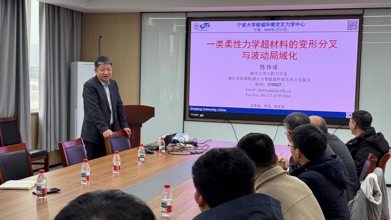 1月17日下午,浙江大学陈伟球教授应邀访问U体育 极端环境交叉力学研究所,并在龙赛理科楼南楼519会议室作了题为“一类柔性力学超材料的变形分叉与波动局域化”的学术报告。本次报告由张阳阳副教授主持,U体育 相关专业师生积极参与,现场学术氛围浓厚。报告中,陈伟球教授系统阐述了其在柔性力学超材料结构设计与力学特性领域的最新研究进展。在静态特性方面,他介绍了通过设计扭曲笼目格栅,结合精细化实验与理论模型,深入揭示了偏转角对变形分叉行为及模态调控的关键影响;在动力学特性方面,陈教授基于六刚性质量块模型,探究了波的传播规律,其理论预测与实验结果高度吻合,并成功捕捉到了显著的波动局域化现象。这些研究成果为材料响应特性的灵活调控及复杂结构中波传播机制的解析提供了重要的理论依据和实验支撑。交流环节中,现场师生就报告内容与陈伟球教授进行了深入探讨。与会师生纷纷表示,本次报告不仅展现了严谨的理论深度与精湛实验技术的紧密结合,更为大家未来的学术探索提供了全新的视角与宝贵的思路。(图文:李琼 极端环境交叉力学研究所)