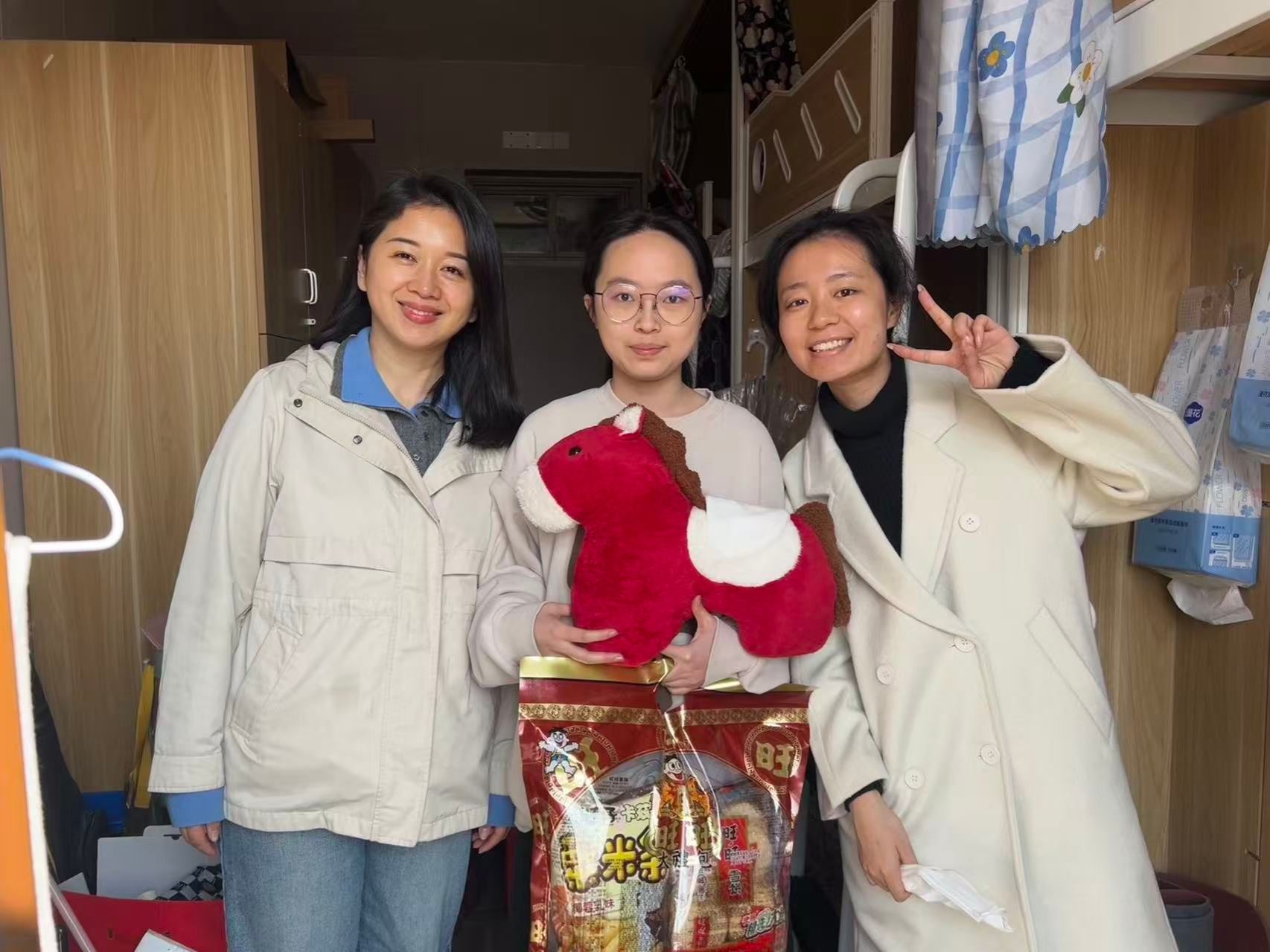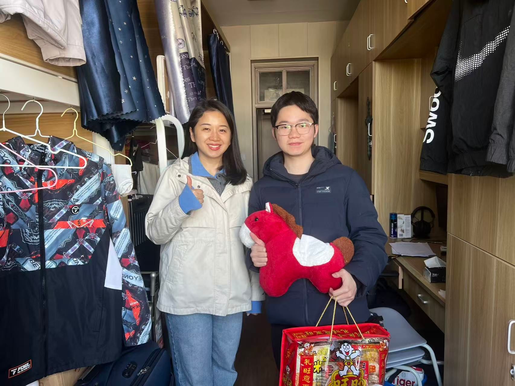走访过程中,沈妍伶副书记特意为同学们准备了寓意吉祥的小马玩偶,寓意新的一年“龙马精神”、“马到成功”,希望同学们在即将到来的马年里学业进步,一马当先。每走进一间宿舍,她都亲手将这份承载着美好祝愿的玩偶送到学生手中,并与同学们促膝交谈,细致入微地询问大家的假期安排和留校原因。