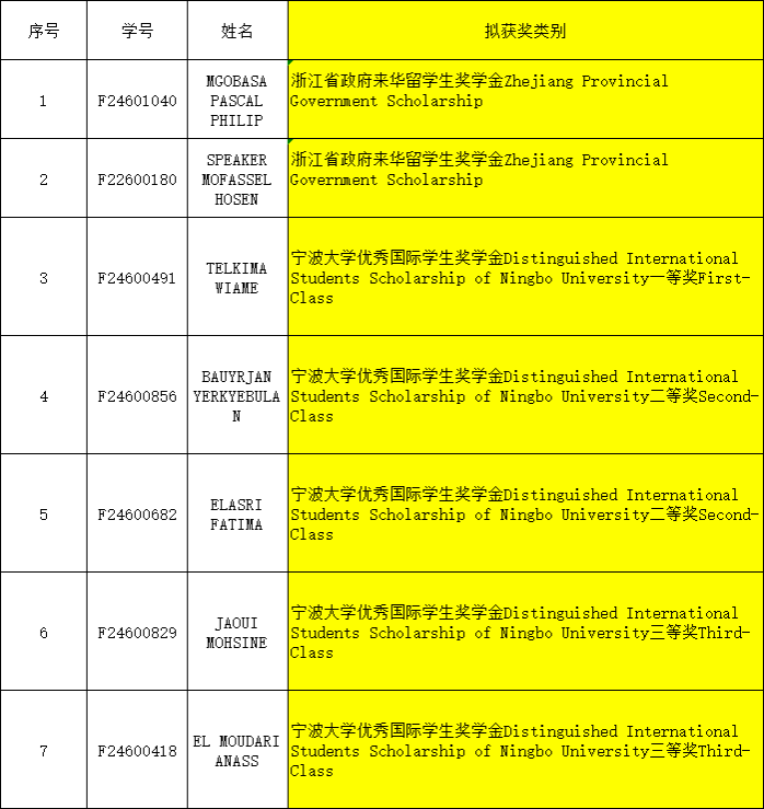 自费国际学生老生奖学金评定拟获奖名单的公示